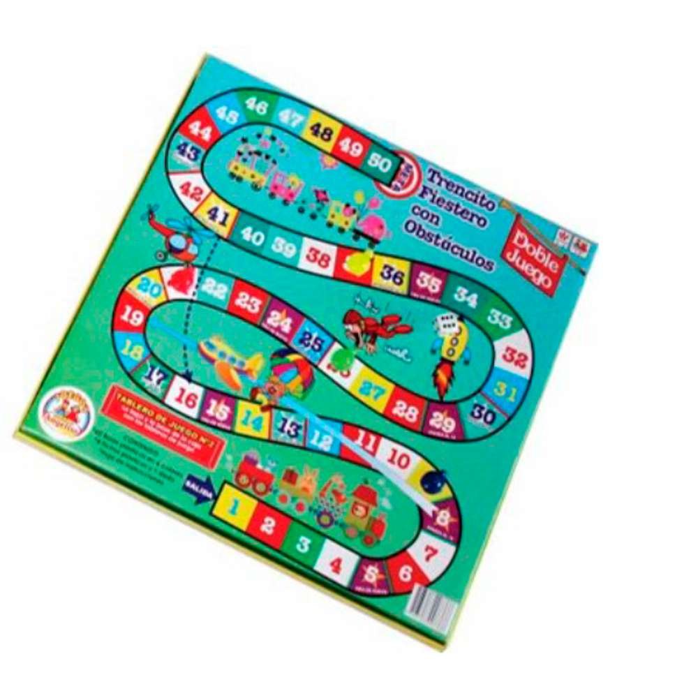 Juego Trencito Fiestero con Obstáculos: la base de la caja es el tablero de juego. Trae 4 fichas plásticas y un dado.