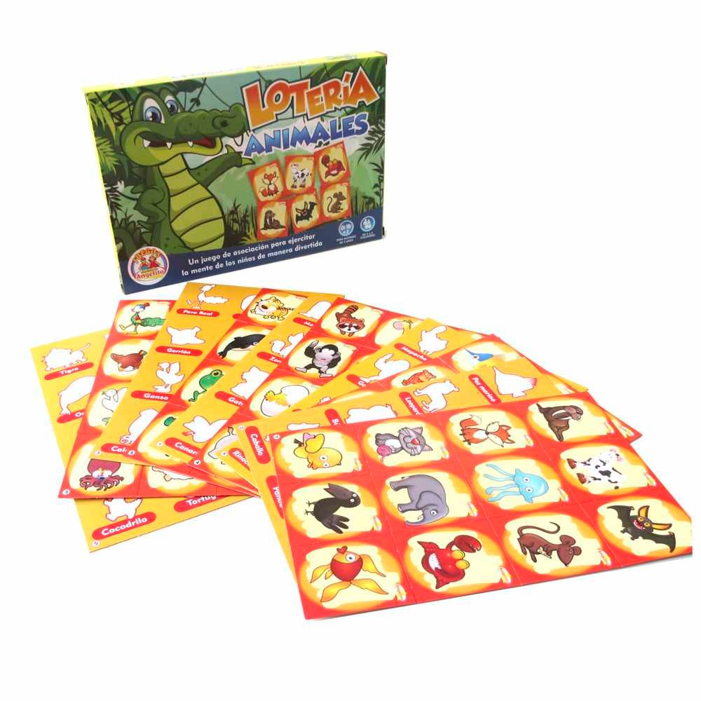 Contenido: 5 cartones de juego con los nombres de los animales y 60 tarjetas con las figuras de los animales.